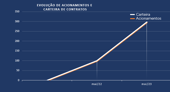 Em maio de 2023, houve um crescimento de 296,81% na evolução de acionamentos em relação ao mesmo período no ano anterior. Com tanta agilidade, a carteira de contratos da nossa agente também aumento, sendo, em maio de 2023, 296,84% maior que o período anterior.